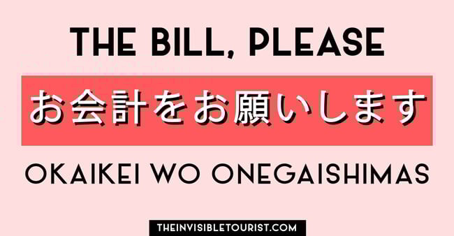 - Once you’ve finished your meal in a restaurant say, Okaikei wo onegaishimas お会計をお願いします to your waiter for the bill/check to be brought over to you for payment.